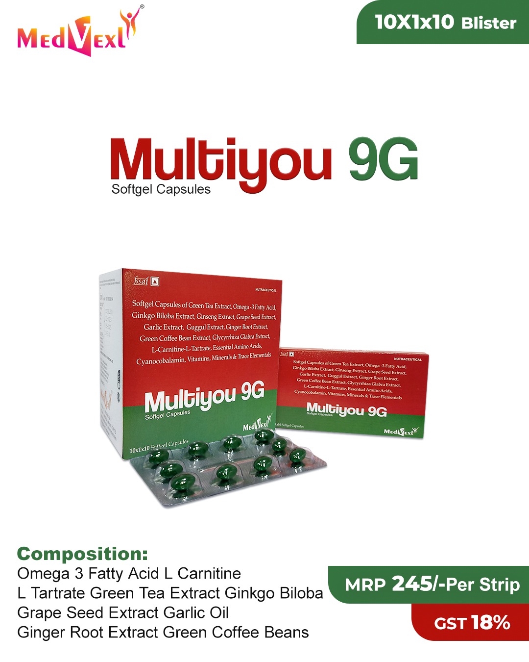 MULTIYOU-9G Capsule | 10*1*10 | Omega -3 Fatty Acid,L-Carnitine, L-Tartrate,Green Tea Extract, Ginkgo Biloba, Grape Seed Extract, Garlic Oil, Ginger Root Extract,Green Coffee Beans Extract, Glycyrrhiza Glabra Extract, Antioxidant, Essential Amino cids Vitamins Minerals & Trace Elemants | Details |