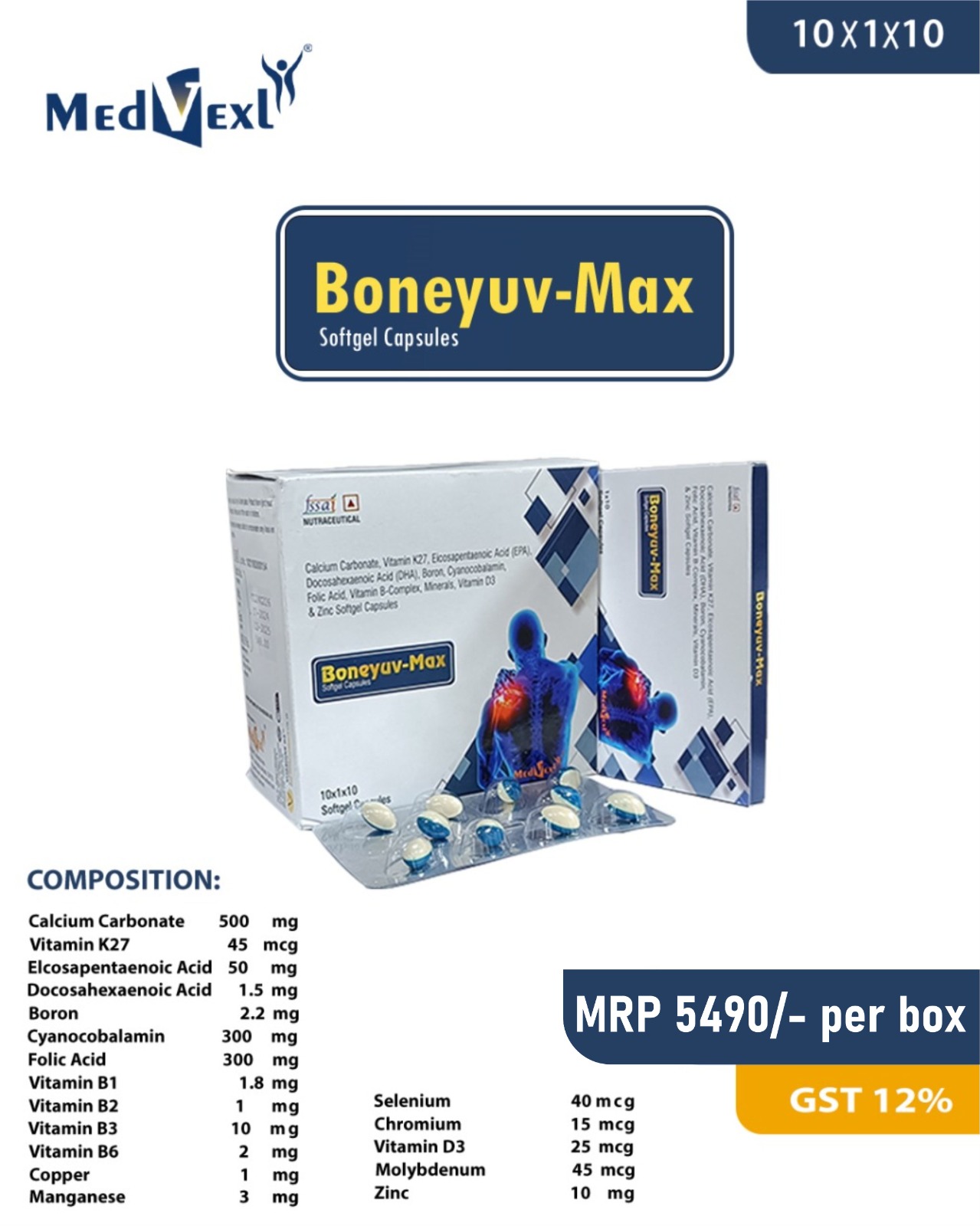 BONEYUV-MAX | 10*1*10 | Calcium Carbonate, Vitamin K27, Eicosapentaenoic Acid (EPA), Docosahexaenoic Acid (DHA), Boron, Cyanocobalamin, Folic Acid, Vitamin B-Complex, Minerals, Vitamin D3 & Zinc Softgel Capsules | Details |