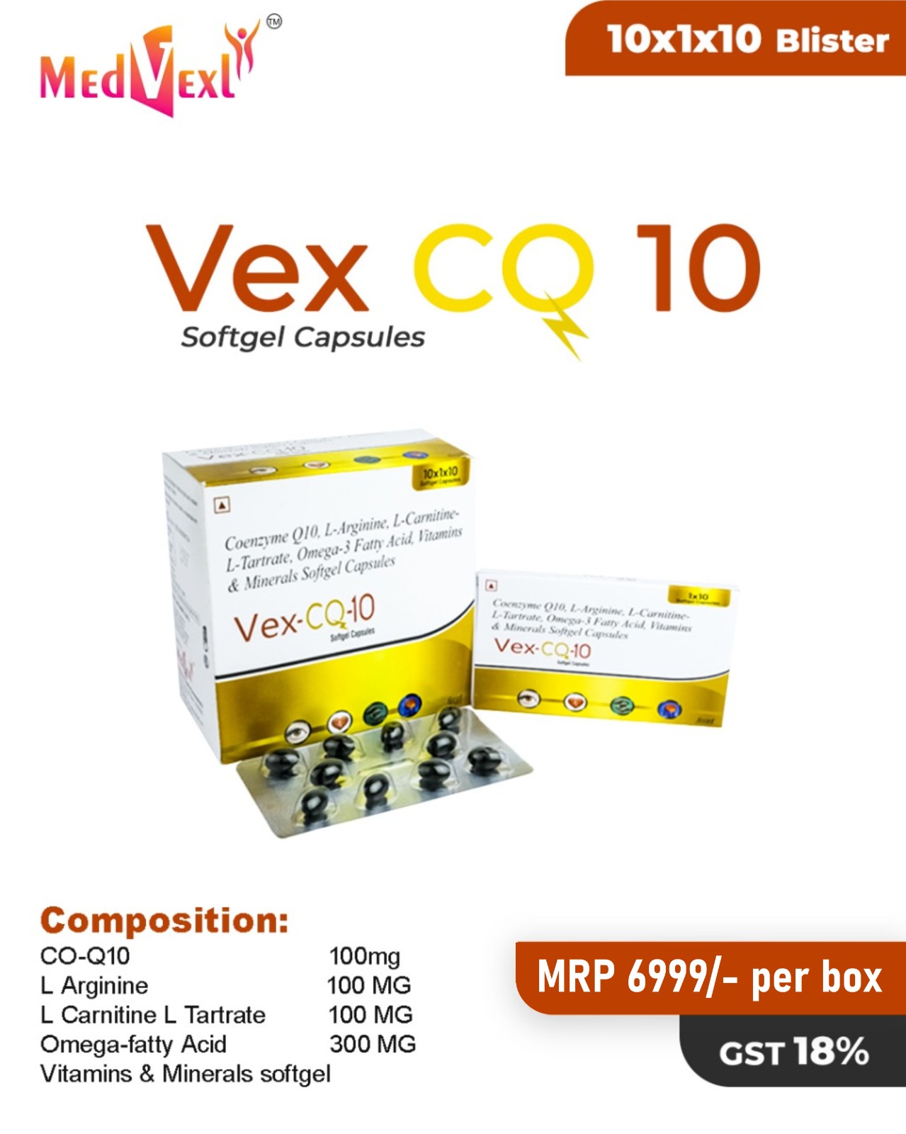 VEX-CQ-10 | 10*1*10 | CO-Q10 100mg,L-Arginine 100 MG, L- Carnitine-L-Tartrate 100 MG, Omega-fatty Acid 300 MG, Vitamins & Minerals softgel | Details |