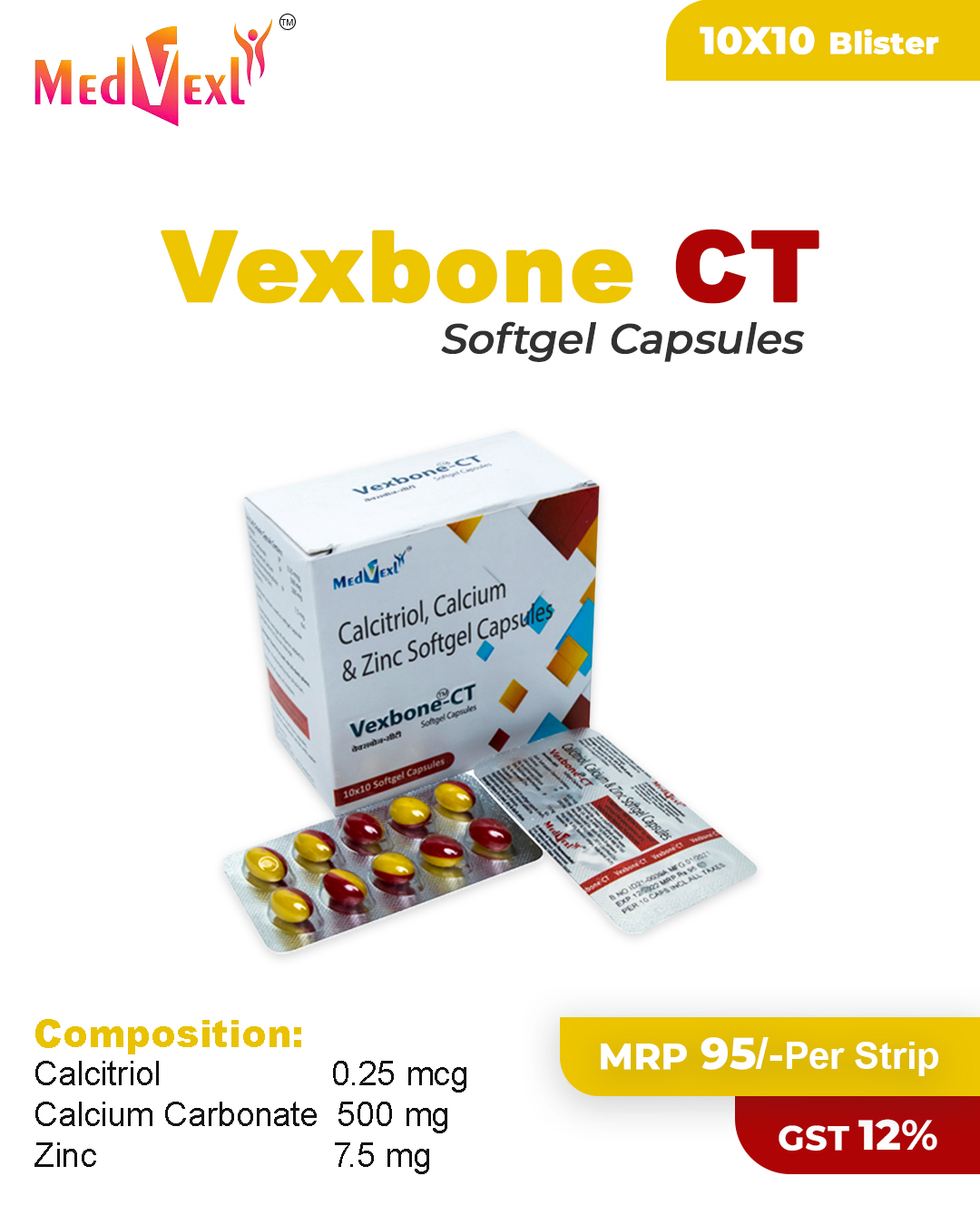 VEXBONE - CT TAB | 10*10 | Calcium Citrate 1000 MG,Calcitriol 0.25mg ,Elemental Zinc 7.5mg, Maganese 40mg | Details |