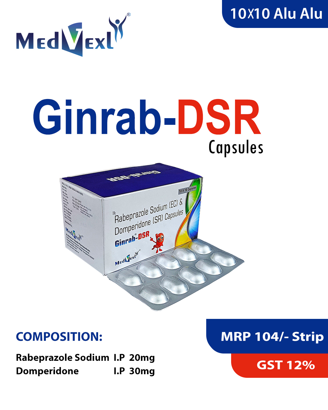 GINRAB DSR | 10*10 | Rabeprazole Sodium I.P 20 mg. Domperidone I.P 30 mg (alu alu) | Details |