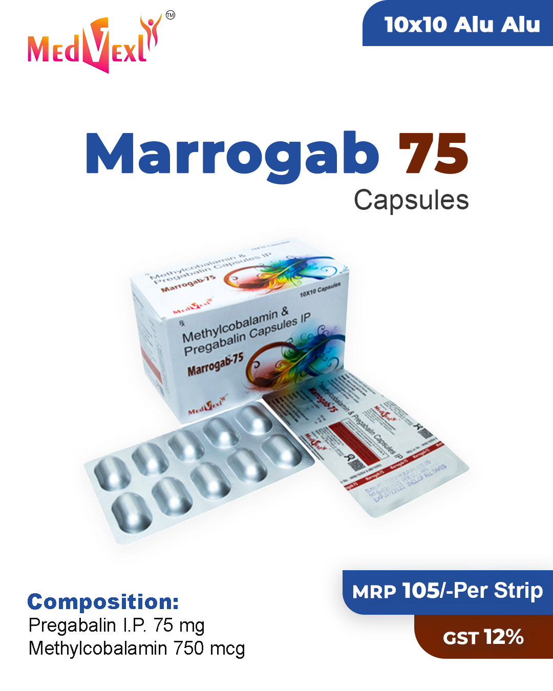 MARROGAB - 75 | 10*10 | Pregabalin I.P. 75 mg + Methylcobalamin 750 mcg (alu alu) in drug | Details |