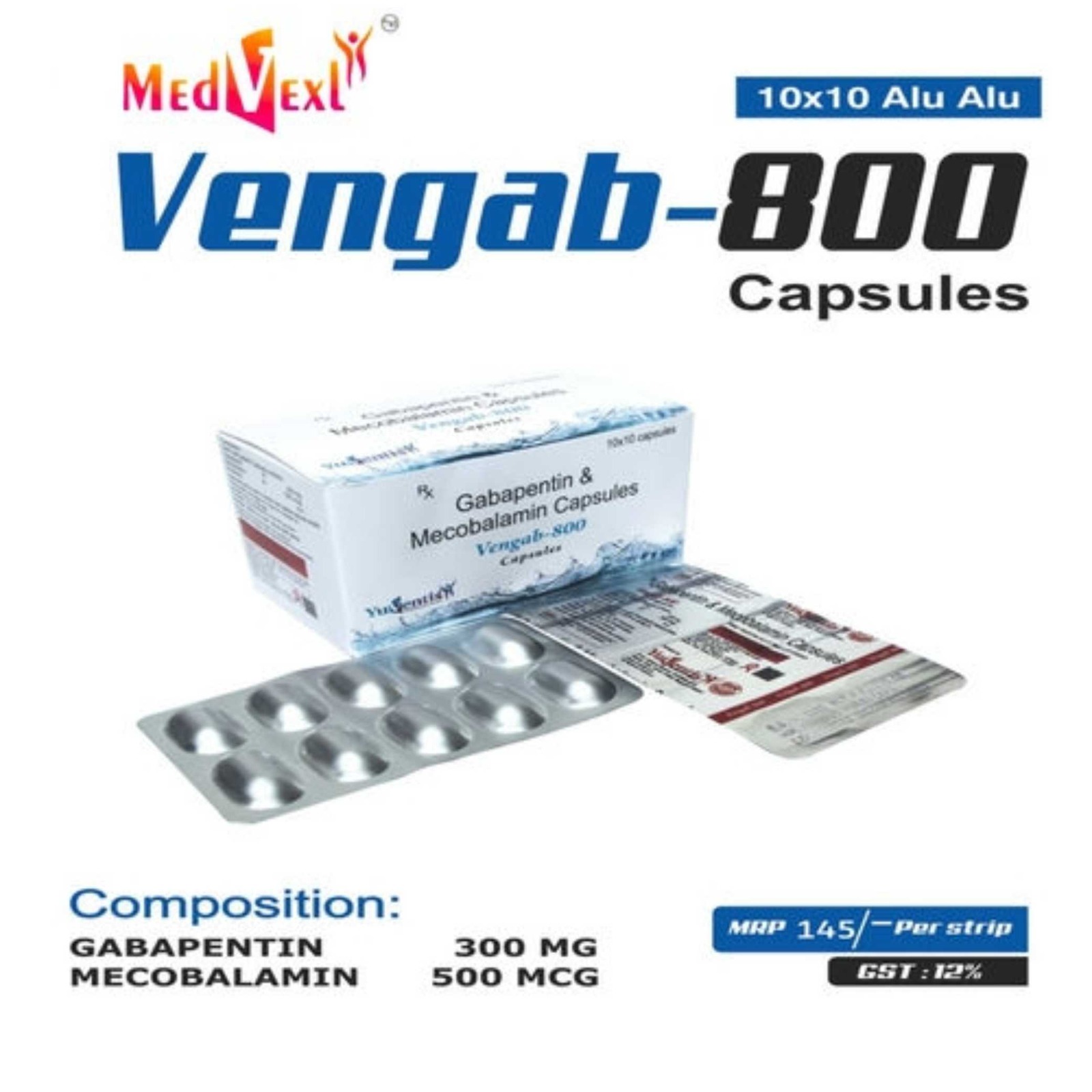 VENGAB - 800 | 10*10 | GABAPENTIN 300MG + MECOBALAMIN 500MCG | Details |