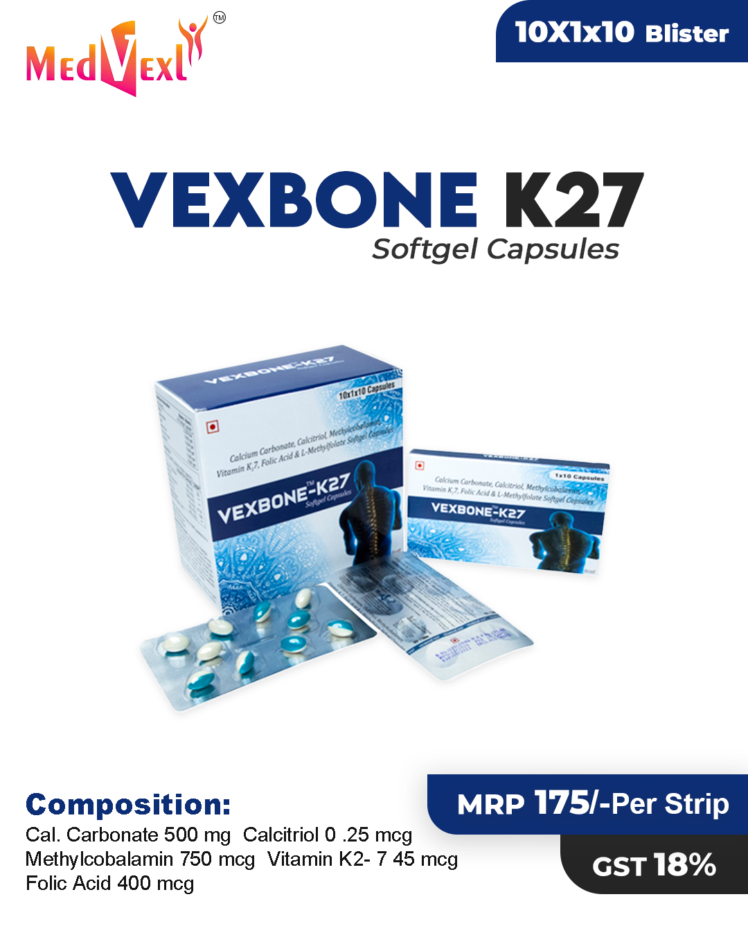 VEXBONE-K2 7 | 10*1*10 | Cal. Carbonate 500 mg + Calcitriol 0 .25 mcg + Methylcobalamin 750 mcg + Vitamin K2- 7 45 mcg + Folic Acid 400 mcg | Details |