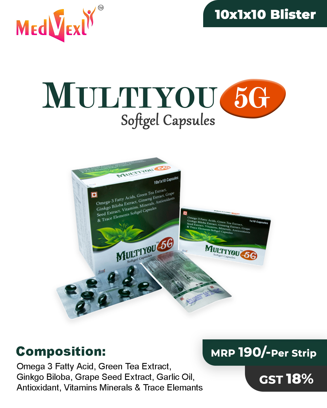 MULTIYOU- 5G | 10*1*10 | Omega -3 Fatty Acid, Green Tea Extract, Ginkgo Biloba, Grape Seed Extract, Garlic Oil, Antioxidant, Vitamins Minerals & Trace Elemants | Details |