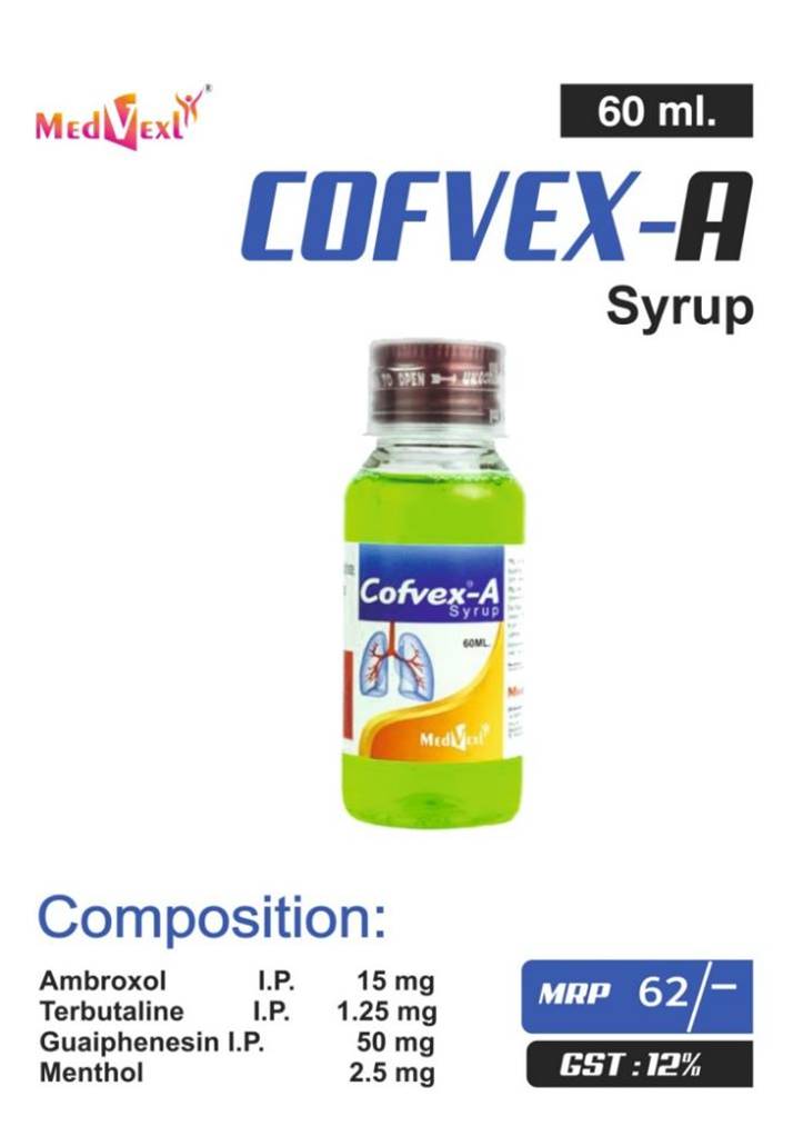 COFVEX-A ( 60 ml) | 60 ml | Ambroxol I.P.15 mg + TerbutalineI.P.1.25 mg + Guaiphenesin I.P.50 mg + Menthol 2.5 mg | Details |