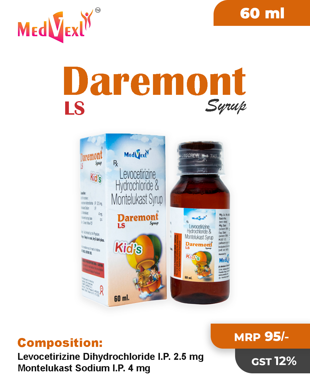 DAREMONT-LS | 60 ml | Levocetirizine Dihydrochloride I.P. 2.5 mg + Montelukast Sodium I.P. 4 mg (Susp.) | Details |