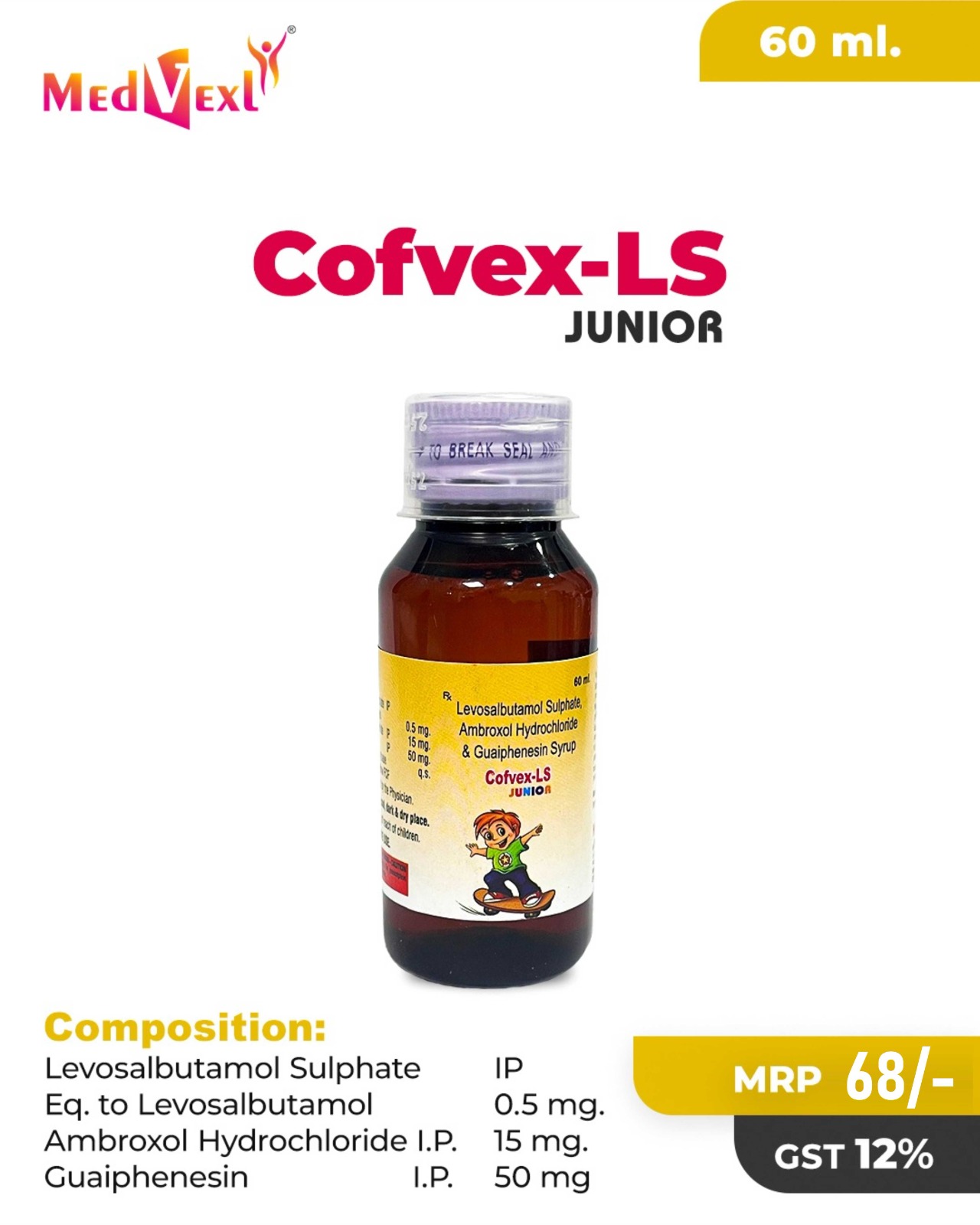 Cofvex-Ls Junior | 60 ml | Levosalbutamol I.P. 0.5mg + Ambroxol I.P. 15 mg + Guaiphenesin I.P. 50 mg syrup | Details |