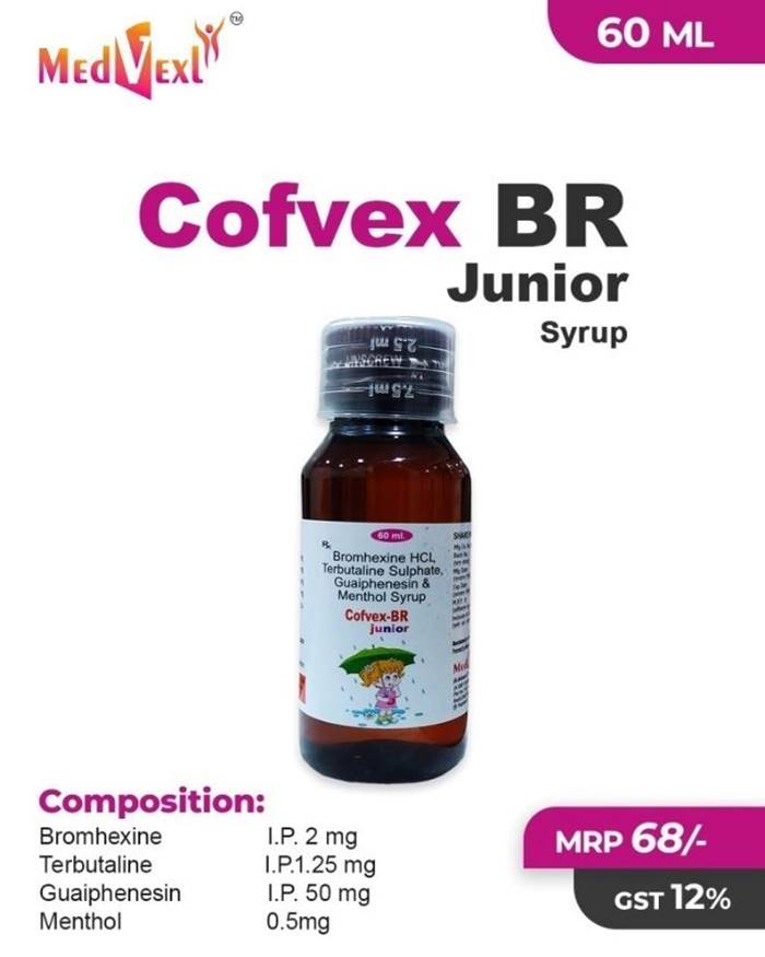 Cofvex-Br Junior Dry Syrup | 60 ml | Bromhexine I.P. 2 mg + Terbutaline I.P. 1.25 mg + Guaiphenesin I.P. 50 mg & Menthol 0.5 mg | Details |