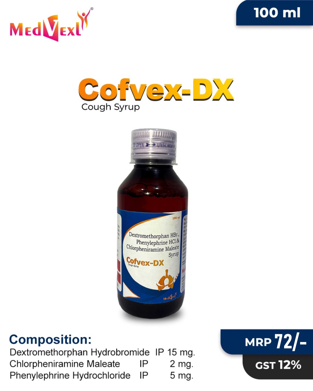COFVEX-DX | 60 ml | Dextromethorphan I.P. 15 mg + CPM I.P. 2 mg + Phenylepherine I.P. 5 mg | Details |